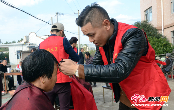 日前,桥头胡街道慈善义工大队组织人员来到桥头胡敬老院,为这里的百余名老人洗头、理发、测量血压、剪手指甲、修脚趾甲等便民服务活动,受到了老人们的欢迎。图为义工们正在为老人理发。