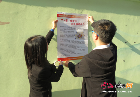 宁海新闻网讯 为进一步增强广大群众识别、抵制传销的能力,连日来,桑洲镇联合县公安局、市场监督管理局开展严厉打击传销违法活动。图为桑洲镇工作人员正在张贴打击传销宣传画册。(徐铭怿胡盼攀摄)
