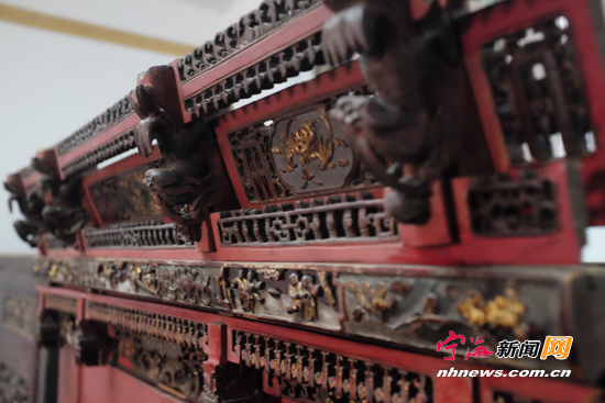 四 曾几何时,宁海的红妆家具也曾和它的色调一样红极一时,应敏明也收藏过不少的红妆家具。让他至今颇为遗憾的是,在红妆家具的收藏过程中,他曾错失过一张极为精彩的朱金拔步床。 有一次,一位古家具商通知应敏明,他刚收到了一张好床。应敏明急匆匆地赶过去,床还没有从车上卸下来,满满一车都是这张床的零件。应敏明第一眼便看见了这张床的屏风,朱红软条,中嵌朱金大花板。这一眼让他断定这是一张难得的好床。费了一些功夫,床从车上卸下,在院子里竖起来。一竖起来,更把应敏明震住了。这张床实在是气势恢宏。较一般床高大许多,屏风和前床窗均为朱花软条嵌朱金花板,床楣双道工,上道七块花板,下道三道朱金满雕檐口,床罩檐上又是朱金满工七道。老收藏都知道,一张朱金拔步床,只要屏风好、床楣好,罩檐好、就一定是好床。这张大床无疑是宁海朱金拔步床中的绝品。但最可惜的是,这张床的花板上所雕刻的西厢记才子佳人故事,因为文革破四旧,人物的人头均被铲平。因为雕刻残缺,当时宁海又没有能修复雕刻的人才,思考再三,应敏明还是放弃了这张床。让他没想到的是,日后,这张床竟然被几位工匠修复,并被上海一位收藏家收购。这位收藏家极为珍爱这张床,逢人便夸,说电影明星成龙从东洋购进的一张价值380万元的朱金拔步床,还不及他这张宁海清中期朱金拔步大床。