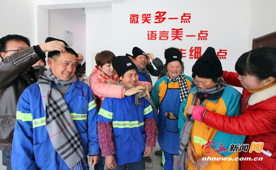 宁海新闻网讯 日前,东观社区在职党员将围巾、帽子送到常年担负辖区卫生清洁的环卫工人手上,在严寒的冬季给城市美容师们带去丝丝暖意。图为在职党员亲手为城市美容师们戴上围巾和帽子。 (李江林袁挺摄)