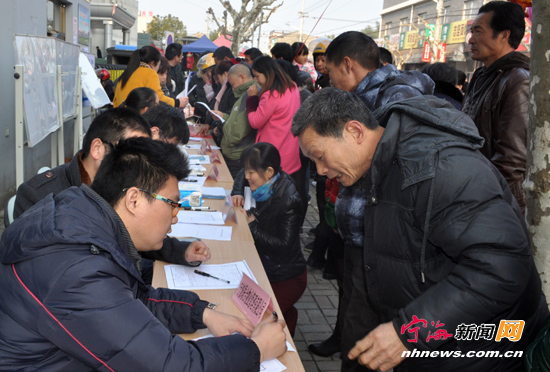 宁海新闻网讯为帮助企业缓解用工难问题,推进新区健康发展,近日,宁波南部滨海新区管委会联合力洋镇,利用集市在力洋市场举行2015年度企业用工首期招聘现场会,共有20余家涉及模具、文具、汽车配件等制造类企业进场招聘,初步达成就业意向近100人,进一步方便当地群众实现家门口就业。 (李江林李品锋 叶丹丹摄) |