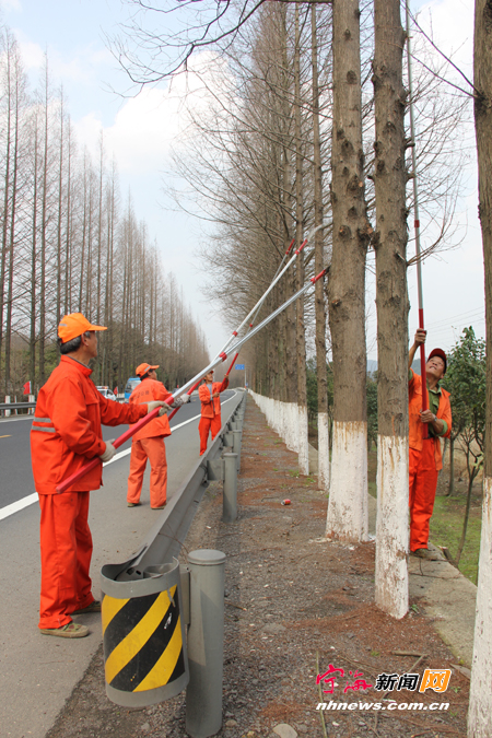 宁海新闻网讯 连日来,县公路局组织所辖6个公路养护所职工,对辖区公路行道树进行春季修剪。与以往不同的是,修剪行道树首次采用了手持式高枝锯进行,不但大大提高了安全性,还增强了工作的效率。(惠广亮杜鹃摄)