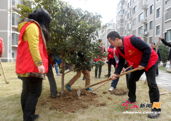 宁海新闻网讯 昨日,桃源街道兴海社区20余名在职党员志愿者到兴海家园开展植树添绿活动,为建设“两美”宁海增彩,受到小区居民好评。(姚亮王雪婷摄)