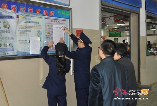 宁海新闻网讯 我县积极响应全省范围内开展的肉品和水产品安全专项整治“百日会战”行动,目前已发放肉品和水产品安全专项整治“百日会战”行动通告1万余份。图为县市场监管局工作人员在农贸市场张贴《通告》。(叶子李鲁文摄)