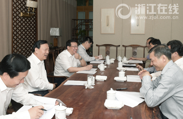 ![]() 夏宝龙在杭州市玉皇山南基金小镇考察时座谈。浙江日报记者 黄曙林/摄