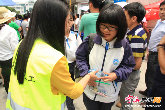 宁海新闻网讯 高考期间,宁海城管义工在宁海中学、知恩中学、柔石中学三个考点设立高考便民服务站,为考生和家长提供免费的防暑药品、矿泉水、考试用具等物品。图为城管义工志愿者们身穿志愿者马甲在考点门口派发矿泉水。(王劲薛风荷摄)