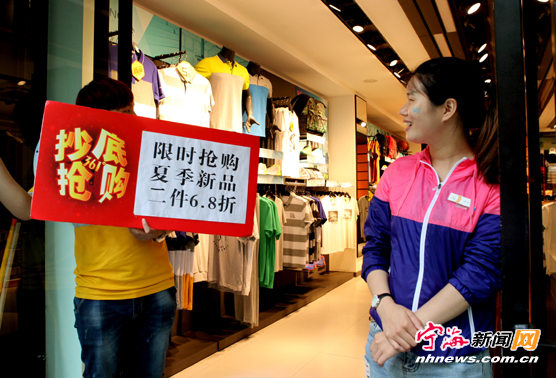 宁海新闻网讯 昨日,城区街头某运动品牌专卖店门口,店员举着新品限时打折的招牌,以吸引顾客。看来如今的市场,无论是新品还是已过季的旧款,都摆脱不了打折。