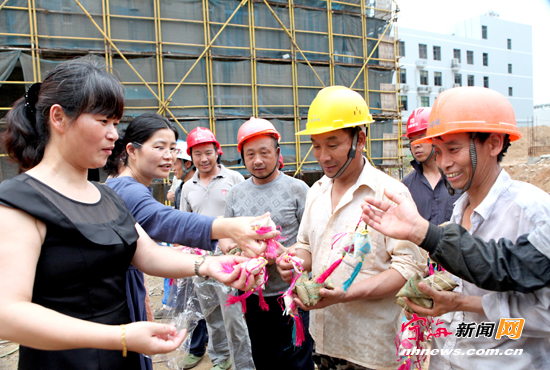 宁海新闻网讯 “这是我们包的粽子,你们尝尝味道如何?”昨日下午,跃龙街道塔山社区工作人员来到东门69号地块建设工地,将包好的粽子和编织的香袋送到施工人员手中,让这些来自江西、安徽、湖北等地为宁海城市建设挥洒汗水的一线工人们感受到家的温暖。(李江林 陈柏邑摄)