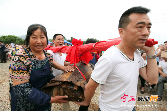宁海新闻网讯 6月20日,为期3天的桥头胡街道第二届铜岭岗“万水千山粽是情”端午民俗文化节活动在铜岭村举办。数千名来自杭州、宁波、台州等地的游客前来体验乡村包粽子、赏粽子、品粽子、买粽子等民俗文化乐趣。图为村民们抬着100多斤重的粽子向游客展示。 (李江林童璐璐摄)