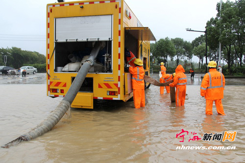 11日上午,“灿鸿”强台风带来了强降雨,造成城区兴宁北路现代家居广场路段大面积积水,县综合执法局环卫处接警后,立即组织人员,派出应急抢险工程车赶赴现场处置,以确保道路交通安全。(惠广亮 薛风荷摄)