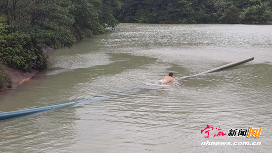 7月10日下午,为防止狮子岩水库水位进一步上涨危及下游群众安全,岔路镇柴家村村委、45岁的党员柴飞云不顾个人安危,在村支委柴毅的协助下,游入狮子岩水库,完成排水管的安装工作。 (章云惠王魁摄)