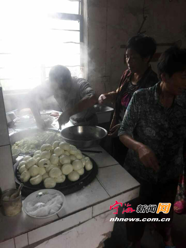 7月11日,宁海县白莲寺柑桔良种场工作人员自发参与烧饭做菜,为安置点内的避灾群众免费提供热饭热菜。(黄浓珍 彭沐阳仇丹娅王根友摄)