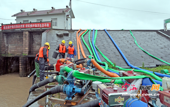 受强台风“灿鸿”影响,闸门关闭,7月11日下午,中铁公司施工人员正在力洋镇高速公路互通钓鱼礁闸门施工标段进行水泵排涝。(李江林李品锋摄)