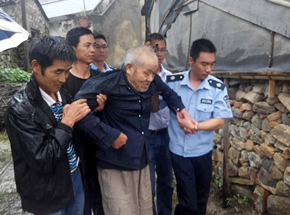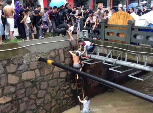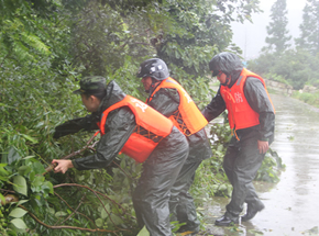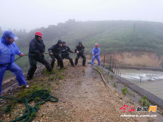 7月11日,持续不断的特大暴雨使县茶山水库水位创历史新高,茶山水库防台人员用绳索把自己串在一起,手拉手,查看水位,以便解除险情,确保下游近万名人民群众的生命财产安全。 (黄浓珍仇丹娅邬福兴摄)