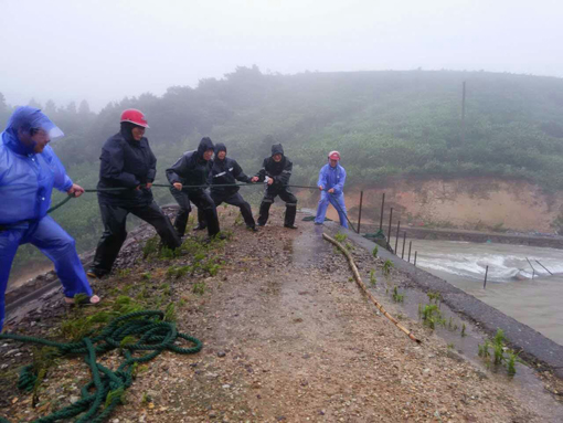 茶山林场防台人员手拉手察看水情