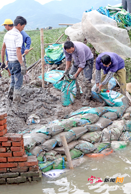 宁海新闻网讯 受台风影响,一市镇旗门塘3000余亩养殖塘被淹,几十只养殖塘堤坝被冲毁。昨日上午,洪水退去后,为减少损失,养殖户们团结在一起,帮助决堤的养殖户加固堤坝。 (李江林周如歆摄)