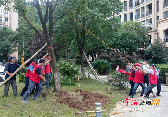 宁海新闻网讯 强台风“灿鸿”过后,大都名苑小区内部分树木倾倒,跃龙街道松竹社区第一时间组织小区党员志愿者等多方力量将倾倒的树木扶正,清理枝条落叶等。(惠广亮柴海勇摄)