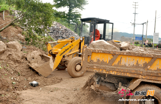 宁海新闻网讯 受台风“灿鸿”影响,盛宁线力洋段一处道路口出现塌方,为确保道路安全畅通,力洋公路养护站组织人员对塌方路段进行清理。图为养护工用铲车将塌方泥石进行铲除。 (李江林李品锋摄)