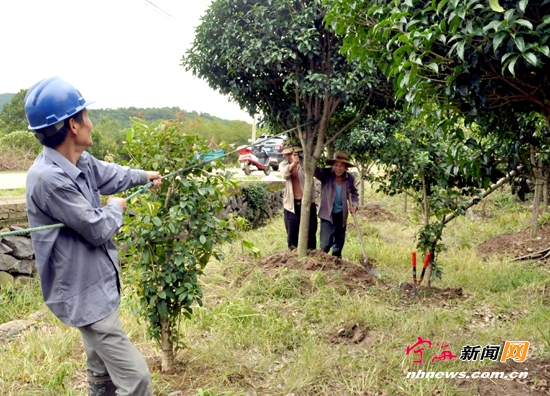 宁海新闻网讯 受台风“灿鸿”影响,我县各地大片绿化林、防护林及行道树等被大风吹倒,为减少损失,力洋镇丹桂种植基地的种植户,立刻组织人员将刮倒的丹桂扶正。 (李江林李品锋摄)
