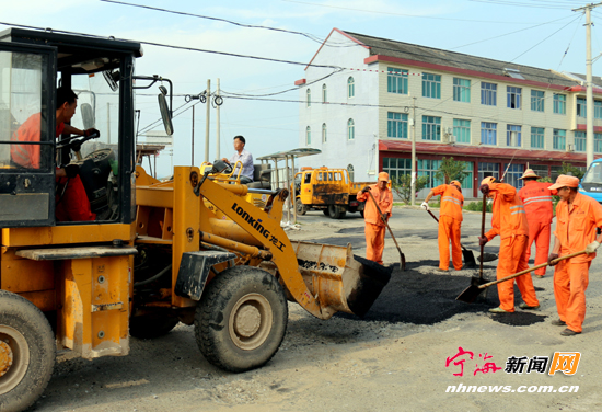 宁海新闻网讯 受台风“灿鸿”的影响,我县许多沥青路面受损,给行车带来安全隐患。为确保道路平整畅通,近几日来,县公路管理部门组织力量对全县沥青路面进行修补。图为昨日下午,养护人员在高温烈日下正在沿海南线伍山段进行沥青路面修补。(李江林 徐桂亚摄)