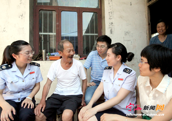宁海新闻网讯 “八一”建军节期间,县国税局组织青年干部来到前童镇大郑村慰问老战士葛财来。今年86岁的葛财来老人曾是我县一名地下交通员。在聆听葛财来老人讲述当年的交通员经历时,青年干部们深受触动,纷纷表示要奋发图强,为实现中华民族的伟大复兴贡献自己的力量。 (李江林 麻万褒摄)