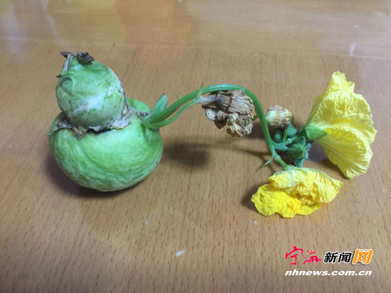 宁海新闻网讯 日前,林大伯在自家阳台的丝瓜藤上,发现长出了一个类似于葫芦的东西。更奇怪的是,把这个“葫芦”摘下来后,每过一天,连在“葫芦”上的花蕾就开出一朵丝瓜花。(通讯员蔡凌玲摄)