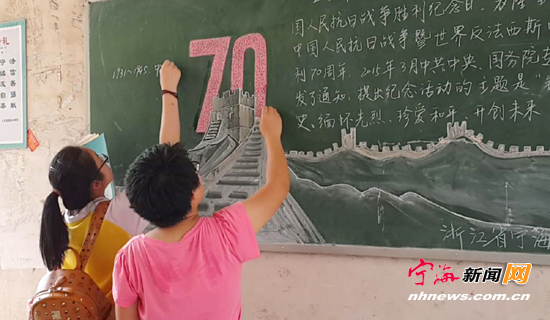 宁海新闻网讯 为纪念中国人民抗日战争暨世界反法西斯战争胜利70周年,连日来,跃龙街道园丁社区的志愿者们以“铭记历史、缅怀先烈、珍爱和平、开创未来”为主题,在辖区各处绘制宣传板报,以弘扬爱国主义精神和民族精神。(惠广亮胡梦月摄)
