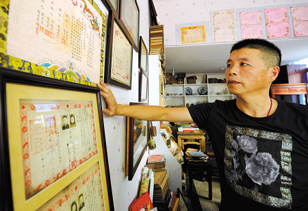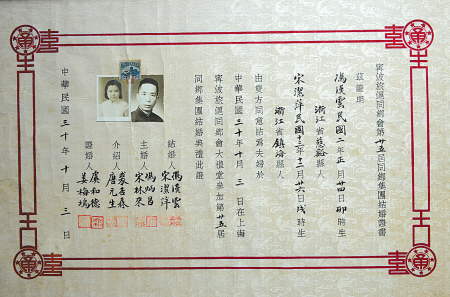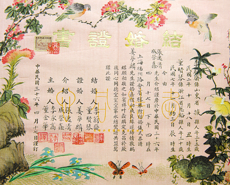 翁炳良和他满墙的结婚证书。 ![]() 1954年的结婚证书。 ![]() 1941年的宁波旅沪同乡会第25届同乡集团结婚证书。 ![]() 1947年大户人家常用的结婚证书样式。 ![]() 珍贵的洪宪元年(1915年)的结婚证书。 宁海县东大街有一间小小的门面,名叫“博古轩”。走进博古轩,环顾四壁,各个年代的结婚证书令人目不暇接。店主翁炳良收藏结婚证书已有20余年。 1996年春,在宁海开旧书店的翁炳良逛杭州收藏品市场时,意外发现一份民国时期的结婚证书,绢面上精致的花鸟画、清秀的楷书字体、美好吉祥的祝词让他爱不释手,当即以180元的价格“淘”了回来,从此一发不可收拾。 2009年前后,翁炳良来到嘉兴工作,这期间成为他收藏结婚证书最密集的时候。因为邻近上海,他常常凌晨3点钟去赶火车,4点半到上海文庙书市,逛上1个多小时,然后再赶回嘉兴上班。经过几年积累,他收集了从清朝末年到文革期间各种材质、款式的结婚证书1000多份。 “珠联璧合欣看红线紧系,花好月圆喜卜白头永偕。”这是当年翁炳良收藏的一份1946年4月结婚证书上的一段祝词。在翁炳良眼里,小小的结婚证书蕴含着丰富的人文、艺术、社会信息。婚书的设计风格、附在上面的印花税票、主婚人的身份、独具特色的结婚贺词,都成为时代变迁的一个个生动缩影。“与我的藏品相比,现在通用的结婚证书有点太简单了。”采访中,翁炳良和记者开起了玩笑。 如今,翁炳良最大的愿望就是建成一个小小的婚证博物馆,让它成为人们了解中国近代婚姻习俗的一扇窗口。(严龙陈云松文/摄) |