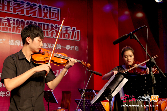 宁海新闻网讯 高雅艺术进驻菁菁校园,音乐灵感激发职教活力。9月21日晚,县第一职业中学举行了“金秋雅韵”欧洲音乐文化艺术节弦乐获奖作品展演活动,由宁波职业技术学院弦乐团全程演奏。图为小提琴二重奏。
