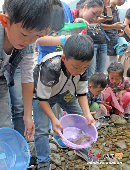 宁海新闻网讯 日前,团县委联合县五水共治办、环保局、新闻中心、电信局开展“孵放小甲鱼,保护母亲河”千名青少年暑期环保社会实践体验活动。近百名市民来到桑洲镇,将由700多名市民孵化的4000只中华冷江鳖放入清溪上游。(李江林林琳摄)