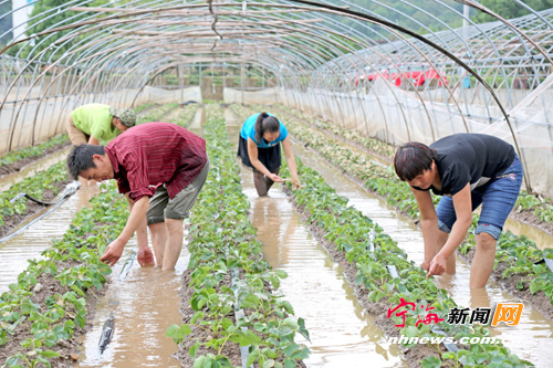 昨日上午,洪水刚刚退去,跃龙街道凌塘村草莓种植户陈云立即组织人员,对受灾的12亩大棚草莓及时进行开沟排水,清洗草莓叶面淤泥,力争把损失降到最低程度。(李江林 华建平摄)