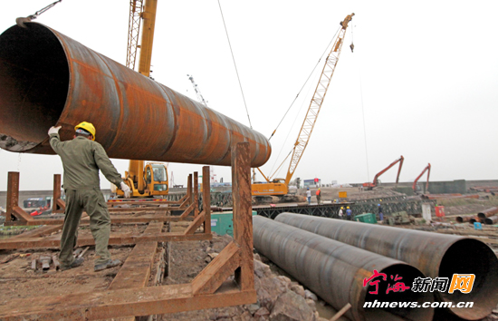 宁海新闻网讯 “十一”期间,中铁大桥局的施工人员正在三门湾大桥及接线(宁海段)工地第TJ8标段吊装直径1.8米的钢护筒。为确保工程质量与进度,该局全体施工人员放弃了“十一”长假休息时间,他们在隆隆机声中忘我地工作着,为我省规划的公路网主骨架建设作出贡献。(李江林 李品锋摄)