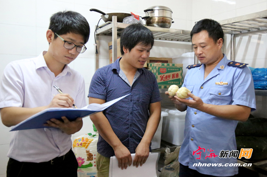 宁海新闻网讯 近日,由梅林街道牵头,会同公安、公管、消防、食监、安监等10余家单位部门组成联合检查组,对梅林街道辖区所有中小学、幼儿园开展了安全大检查。图为食品药品监管人员正在学校食堂检查食品安全。