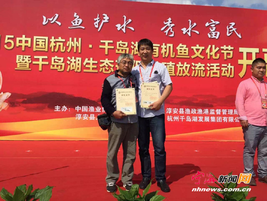 宁海新闻网讯 日前,中国杭州·千岛湖有机鱼文化节暨千岛湖生态环保增殖放流活动在千岛湖广场举行,同时为全国鱼拓大赛获奖者颁奖,宁海人顾振耀(左)创作的鱼拓作品《鲈鱼》荣获金奖。(通讯员顾恺摄)