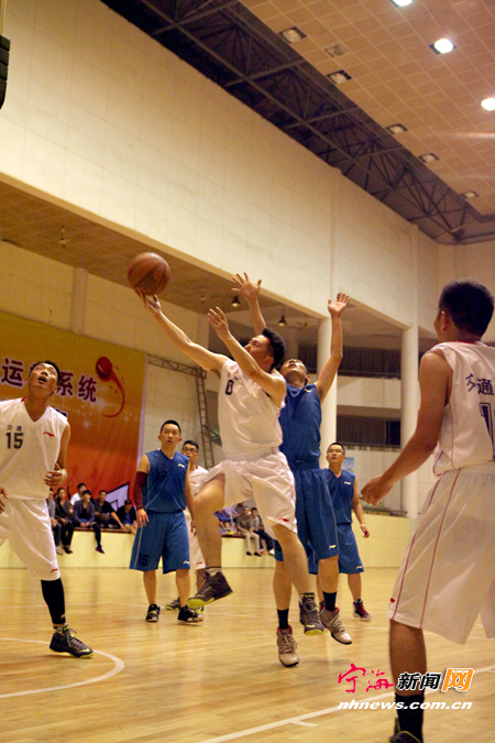 宁海新闻网讯 日前,宁海县第三届交通运输系统篮球比赛在县体育馆落幕,本次为期7天的篮球赛,共有交通运输系统9个代表队的108名运动员参加。最终,县长运公司、公路局、交通工程监理公司代表队获得了前三名。图为参赛队员在激烈角逐。(李江林王昌明摄)