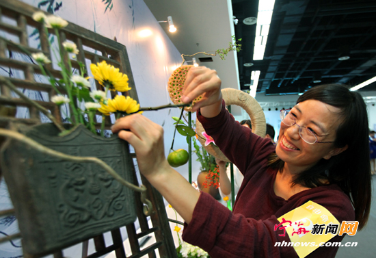 宁海新闻网讯 前日上午,由宁波市总工会、宁波市人社局、宁波市城市管理局主办的2015宁波市“大家和杯”插花员职业技能大赛在宁海国际会展中心举行,来自慈溪、余姚、奉化、宁海、象山及宁波市各区的56名插花能手汇聚一起,展现插花艺术水平。 (李江林 王晓娜摄)