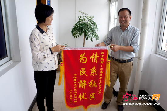 宁海新闻网讯近日,跃龙街道北星社区代表辖区居民将一面“情系社区,为民解忧”的锦旗送到县综合行政执法局市政管理科,感谢他们对气象南路52弄附近的一块垃圾聚集地进行清理改造,成为一片居民娱乐休闲之地,有效保障卫生整洁与居民出入安全。(姚亮叶佳摄)