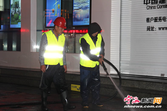 宁海新闻网讯 为了配合做好四条“示范路”创建工作,近日,县环卫处配备了2辆高压冲洗车、6名工作人员,每天对城区中山路、中大街、兴宁路、桃源路的人行道路面进行循环冲洗。(王劲曹秋红摄)