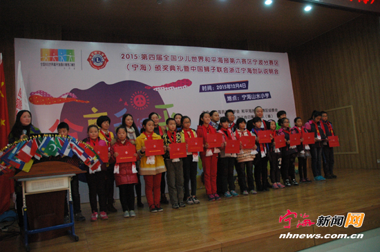 宁海新闻网讯 日前,2015第四届全国少儿世界和平海报第六赛区宁波分赛区(宁海)颁奖典礼在山水小学举行。活动主办方为获得本次和平海报评选的宁海学子颁发荣誉证书,借此把和平的种子种进他们的心田,鼓励他们继续做好事做善事。(记者陈静珠摄)