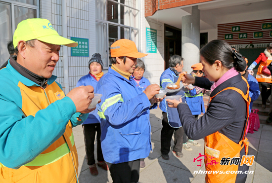 宁海新闻网讯 “冬至”是中国农历中一个重要的节气,也是中华民族的一个传统节日。日前,塔山社区与宁海农村商业银行东方支行共同举办“情暖冬至·爱在塔山”吃汤圆活动,社区工作者和志愿者将煮好的汤圆,供过路的市民和负责辖区卫生保洁的环卫工人们品尝。 (李江林李昕华建平摄)