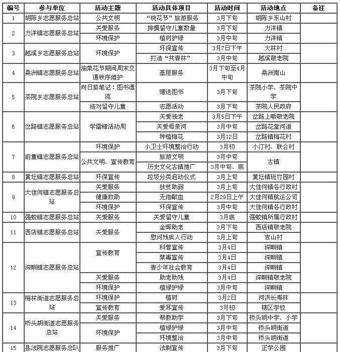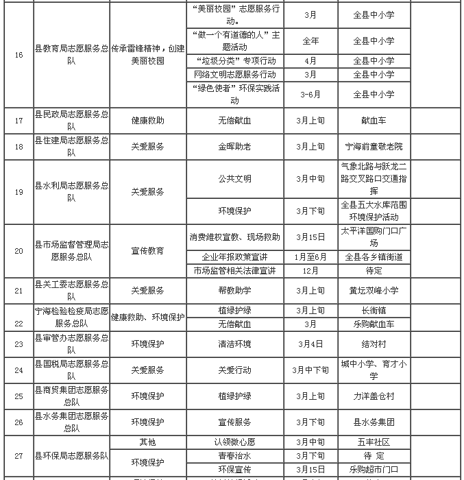 今年3月5日是第53个学雷锋纪念日。为深入贯彻践行社会主义核心价值观,持续推进雷锋精神常态化,在全社会大力弘扬“奉献、友爱、互助、进步”的志愿服务精神,县委组织部、县文明办、团县委、县新闻中心、县广播电视台、县志愿者协会决定在3月份,联合开展“学雷锋志愿服务月”活动,组织全县83支志愿服务组织紧紧围绕“环境整治”、“平安宁海”、“美丽县城”、“三关爱”等群众关心的切身问题,持续开展132个志愿服务项目,号召全县市民、志愿者以实际行动向雷锋同志学习,营造全民参与志愿服务的良好氛围。 据悉,3月5日上午,县委组织部、县文明办、团县委、县新闻中心、县广播电视台、县志愿者协会还将举行“学雷锋活动月”启动仪式暨第四届宁海志愿服务广场文化活动,将活动推向高潮,来自各乡镇街道志愿服务总站、各县直机关志愿服务总队以及社会各界民间志愿服务组织共79个志愿服务组织的志愿者们,将在青少年活动中心内广场开展现场志愿服务和公益演出。 duang~duang~duang~为深入践行社会主义核心价值观,在全社会大力弘扬“奉献、友爱、互助、进步”的志愿服务精神,以实际行动书写新时代的雷锋故事,县委组织部、县文明办、团县委、县新闻中心、县广播电视台、县志愿者协会决定从3月份起,联合开展“学雷锋活动月”活动,雷锋月,让我们一起行动起来!为新常态下的“雷锋们”点赞! 参与单位:全县各级志愿服务组织 活动时间:3月5日(星期六)上午9:00 具体项目:推广宣传、现场服务、现场演示等活动 活动主题:“学雷锋活动月”启动仪式暨第四届宁海志愿服务广场文化节 活动地点:县青少年活动中心内广场(记者章莉通讯员林琳) “学雷锋志愿服务月”系列活动详见下图 ![]() ![]() ![]() 主办单位:县委组织部、县文明办、团县委、县新闻中心、县广播电视台 承办单位:县志愿者协会 咨询电话:65253535