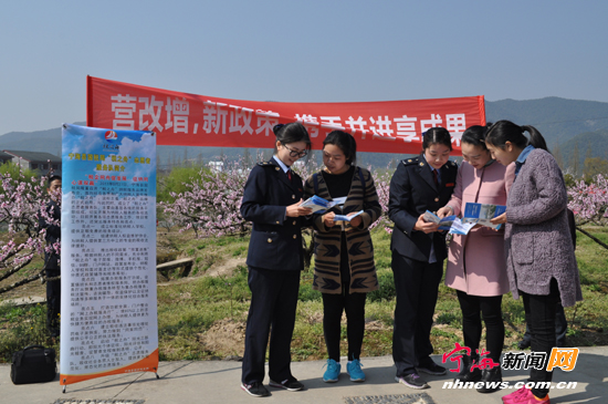 宁海新闻网讯 3月29日,国税力洋分局在胡陈东山桃园举办以“税收桃花别样红”为主题的税收宣传活动,邀请诚信企业纳税人代表共同参与,与游客积极互动,发放税收宣传资料,并向游客讲解营改增相关政策,从而扩大营改增知晓度和影响面。(记者何莎莎 通讯员史雪灵摄)