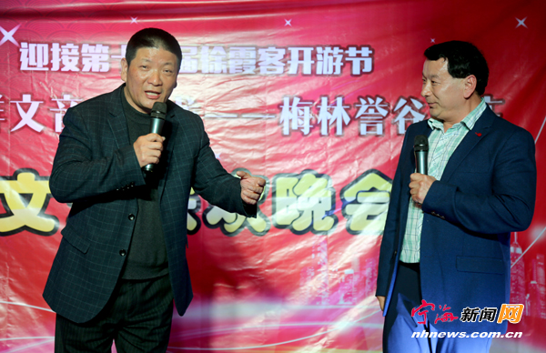 为迎接第十四届开游节,近日,宁海群文音乐沙龙联谊会在梅林誉谷山庄举行喜迎开游节文艺联欢晚会。来自县内的一批文艺骨干欢聚一堂,歌舞、戏剧、相声、器乐演奏等节目精彩纷呈,博得现场观众的阵阵掌声。