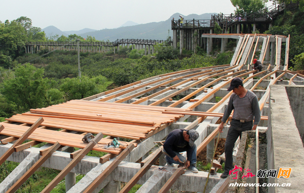 宁海新闻网讯 昨日,施工人员正在王干山景区铺设观景木栈道。为喜迎第十四届徐霞客开游节,让游客全景360度观赏三门湾美景,连日来,越溪王干山景区投资100余万元,对原观景木栈道进行延展与维修,以杜绝安全隐患,从而提升游客满意度和景区美誉度。 (记者惠广亮通讯员章亚丽摄)