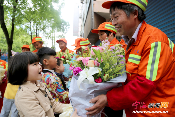 宁海新闻网讯 近日,滨溪社区携同新苗幼儿园开展“你们扮靓城市鲜花传递敬意”活动。小朋友们在花艺老师的指导下包了一束束鲜花送给环卫工人,感谢他们为城市整洁付出的辛勤劳动。 (记者姚亮通讯员建平郑洁摄)