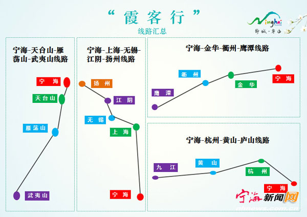 “霞客行” ——重现徐霞客从宁海西门出发,游历华东地区的四条精品线路。 ![]() 宁海-天台山-雁荡山-武夷山线路 【霞路南下】线路节点:宁台雁武 D1:自宁海出西门——宁海【中国旅游日纪念馆】——宁海【梁皇山】——宁海【徐霞客古道】——宿宁海 D2:出发去天台——天台山【国清寺】——天台山【石梁飞瀑】——宿天台山 D3:出发去温州——雁荡山【大龙湫】——夜游雁荡山【灵峰夜景】——宿雁荡山 D4:出发去福建——武夷山【九曲溪漂流】——宿武夷山市 D5:游览武夷山【隐屏峰】——【天游峰】——【虎啸岩】——结束 宁海-上海-无锡-江阴-扬州线路 【霞踪北上】线路节点:宁沪锡扬 D1:自宁海出西门——宁海【中国旅游日纪念馆】——宁海【梁皇山】——宁海【徐霞客古道】——宿宁海 D2:出发去上海——松江【佘山国家森林公园】——松江【辰山植物园】——宿佘山 D3:出发去无锡——宜兴【善卷洞、张公洞】——江阴【徐霞客故居】——宿江阴 D4:游览江阴【徐霞客文化博览园】——出发去扬州——扬州【瘦西湖】——宿扬州 D5:游览扬州【二十四桥景区】——结束 宁海-金华-衢州-鹰潭线路 【霞光东来】线路节点:宁金衢鹰 D1:自宁海出西门——宁海【中国旅游日纪念馆】——宁海【梁皇山】——宁海【徐霞客古道】——宿宁海 D2:出发去金华——【金华古城】——【金华山】——【双龙洞】——宿金华 D3:出发去兰溪——兰溪【六洞山地下长河】——出发去衢州——江山【江郎山】——宿江山 D4:游览江山【仙霞关】——出发去鹰潭——【上清古镇】——宿鹰潭 D5:游览鹰潭【龙虎山景区】——结束 宁海-杭州-黄山-庐山线路 【霞影西游】线路节点:宁杭黄庐 D1:自宁海出西门——宁海【中国旅游日纪念馆】——宁海【梁皇山】——宁海【徐霞客古道】——宿宁海 D2:出发去杭州——【西湖】——【钱塘江六和塔】——宿杭州 D3:出发去黄山——游览【黄山风景区】——【黄山醉温泉】——宿黄山市 D4:游览白岳【齐云山】——【榔梅庵】——【文昌阁】——出发去九江——宿九江 D5:游览【庐山风景区】——【三叠泉】——【五老峰】——结束 |