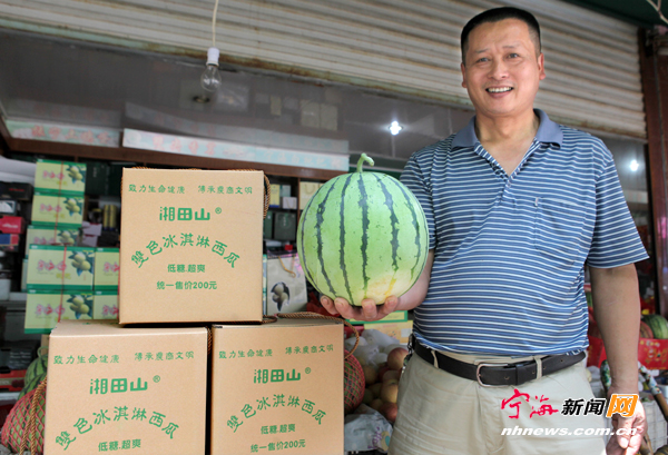 宁海新闻网讯 昨日,城区华庭菜市场门口的水果店老板,正在售卖今年上市第一天的“湘田山”牌双色冰淇淋西瓜。“湘田山”牌双色冰淇淋西瓜是宁海县金龙浦农业专业合作社的特色拳头产品,售价每个为200元。虽然该西瓜售价昂贵,但还是受到一些消费者的青睐。 (记者惠广亮摄)