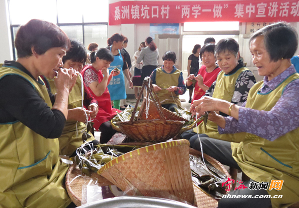 宁海新闻网讯 日前,桑洲镇组织40余名党员干部来到坑口村文化礼堂开展“党群同心圆端午粽飘香”活动。党员们和村民一起淘米、洗粽叶,切磋包粽子技艺,其乐融融,最后党员们还将煮好的粽子分发给村民,既增添了节日气氛,又增进了党员干部与村民的联系。